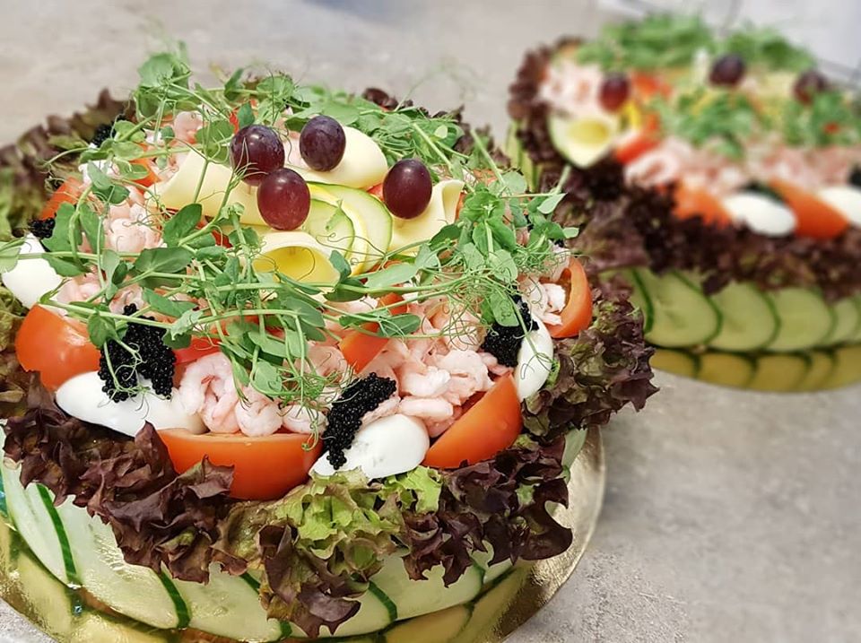Vi gör alltid våra egna röror och använder handskalade räkor. Tårtorna finns i 3 olika varianter; Räkor, Skinka och Kalkon.